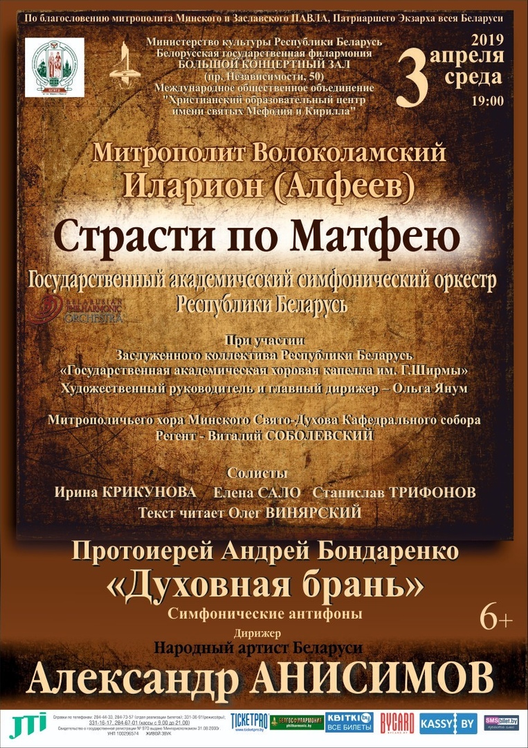 Дорогие друзья, 3 апреля 2019 года в Большом зале Белорусской государственной филармонии в 19 часов состоится концерт Государственного академического симфонического оркестра Республики Беларусь, организованный по благословению митрополита Минского и Заславского Павла, Патриаршего Экзарха всея Беларуси в рамках культурно-образовательной программы Христианского образовательного центра имени святых Мефодия и Кирилла "Музыкальное приношение".